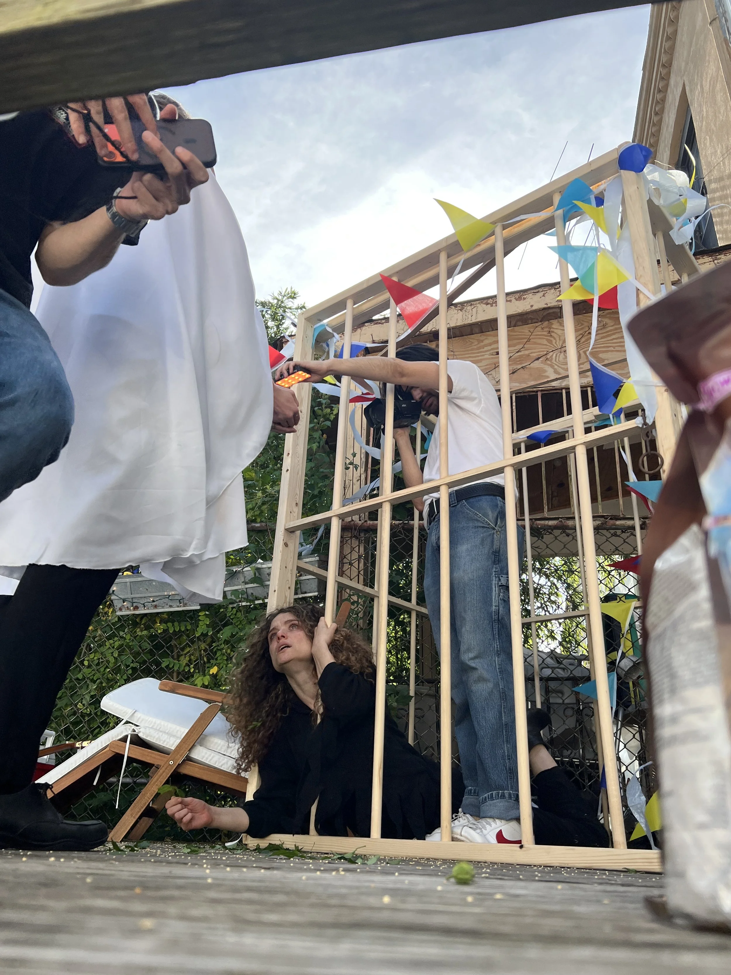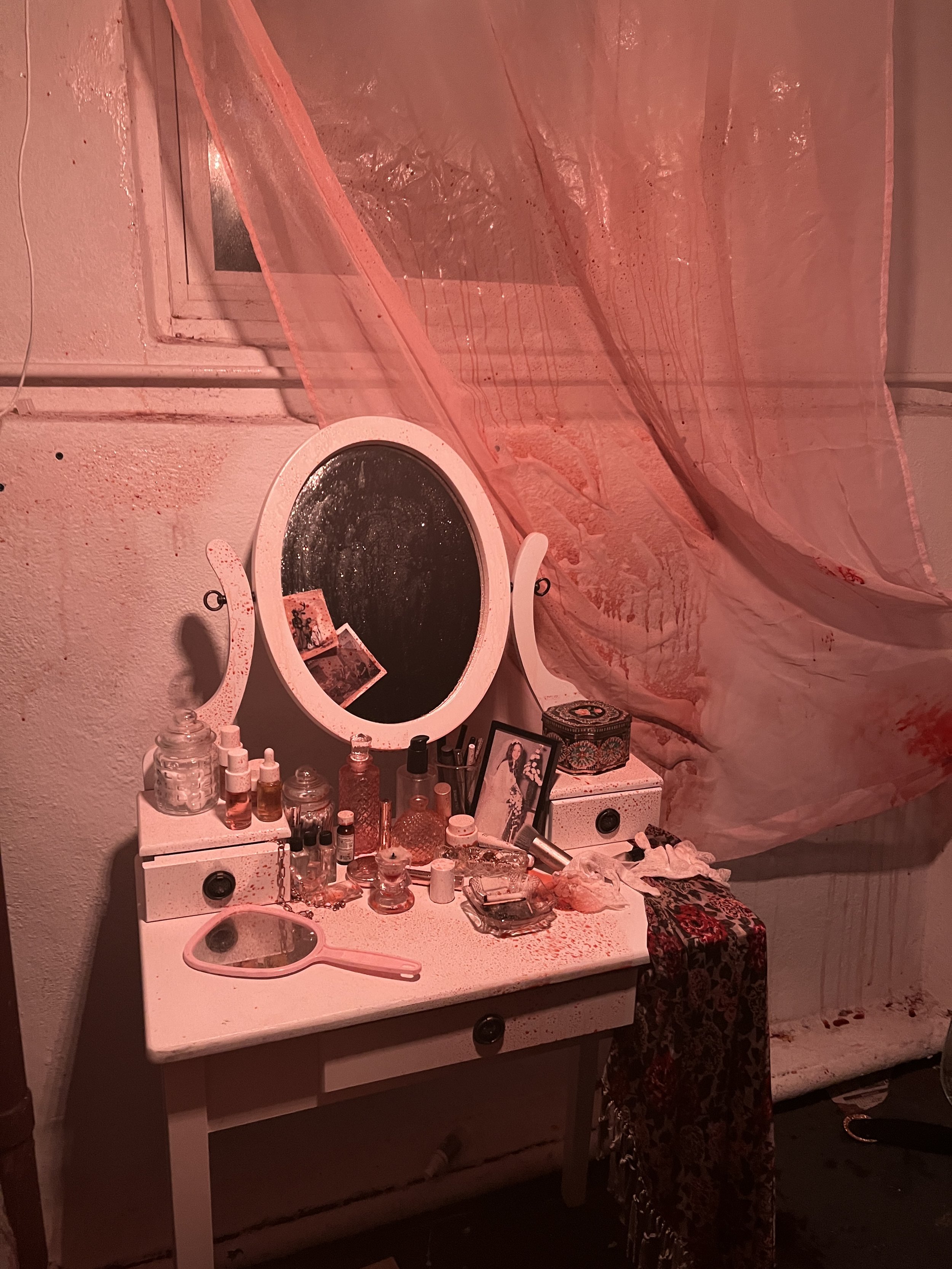Full production design for interior wedding hall, interior dressing room, exterior yard including birdcage. On-set special effects including two types of blood squibs and latex wounds.